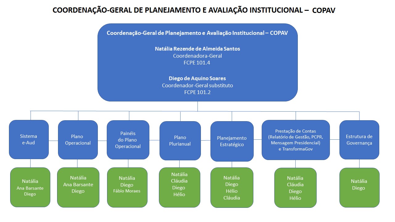 Este organograma apresenta a estrutura organizacional e os temas de responsabilidade da Coordenação-Geral de Planejamento e Avaliação Institucional - COPAV, subordinada à Diretoria de Governança - DIGOV (antes denominada Diretoria de Planejamento e Desenvolvimento Institucional - DIPLAD).