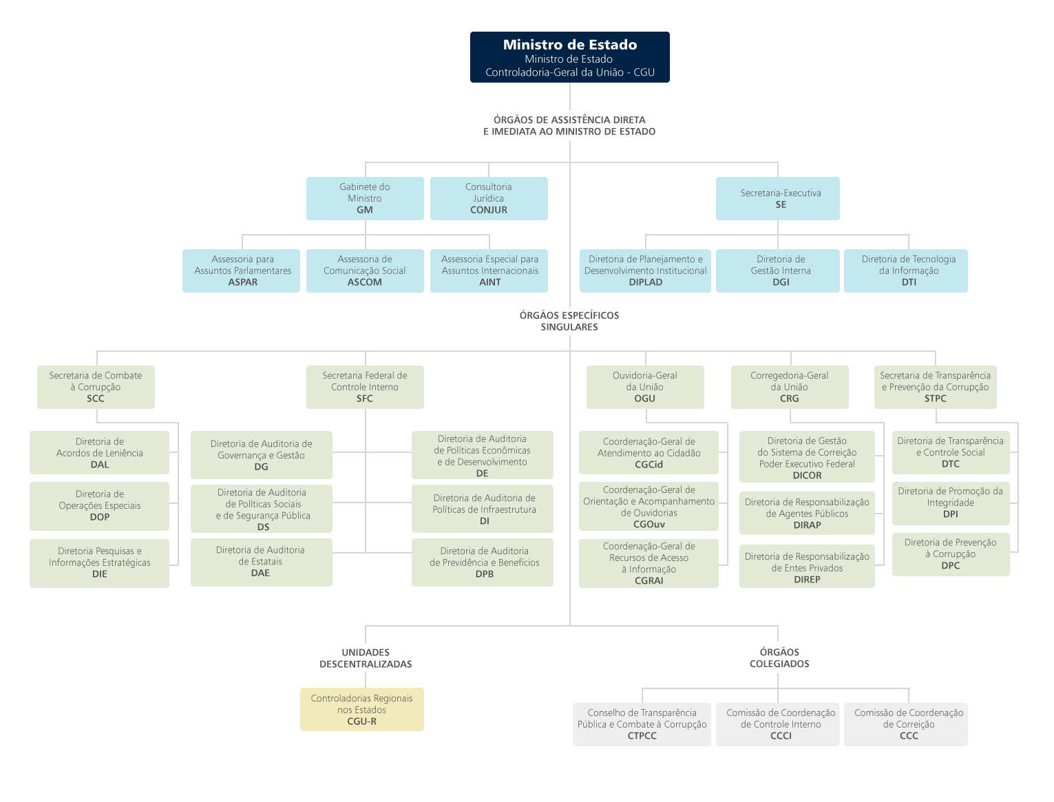 Este organograma apresenta a estrutura organizacional da Controladoria-Geral da União (CGU), estruturada em cinco unidades finalísticas, que atuam de forma articulada, em ações organizadas entre si: Secretaria de Transparência e Prevenção da Corrupção (STPC), Secretaria Federal de Controle Interno (SFC), Corregedoria-Geral da União (CRG), Secretaria de Combate à Corrupção (SCC) e Ouvidoria-Geral da União (OGU).